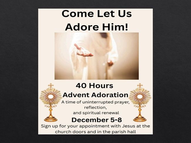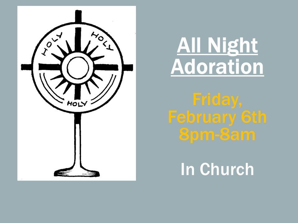 Adoration: Monday & Tuesday 5:00 - 6:00 p.m. , Thursday 6:30p.m. - 8:00p.m., Friday 9:00a.m.